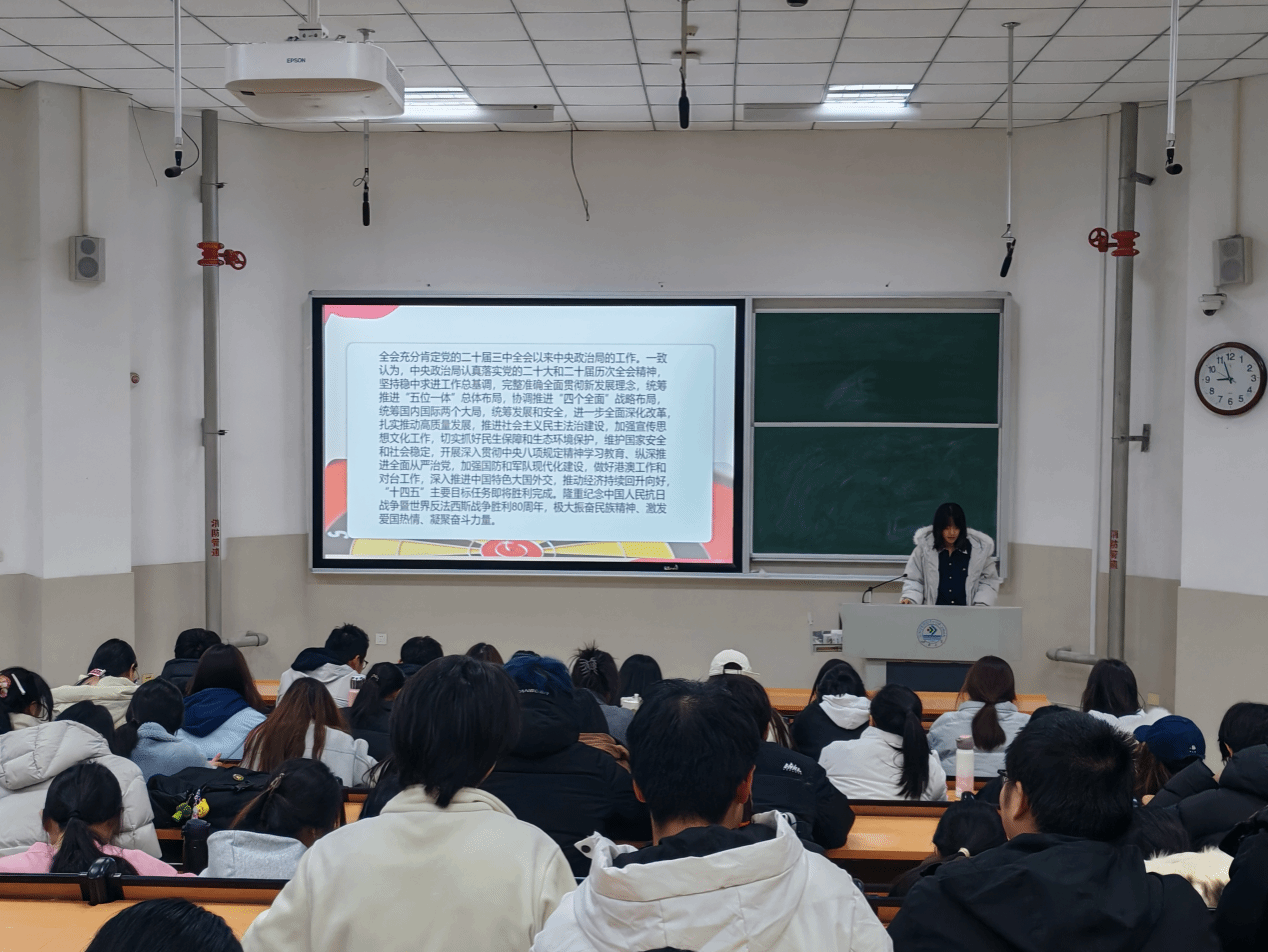 本次团课由学院学生会思政部部长王钰涵主讲,围绕全会核心内容,结合《中共中央关于制定国民经济和社会发展第十五个五年规划的建议》,从“十四五”时期发展成就、“十五五”时期主要任务、高质量发展相关方向等维度展开解读。她重点结合学生学习生活实际,阐释了全会精神与青年成长的关联,帮助大家明确国家发展方向对个人学习与实践的指引意义。