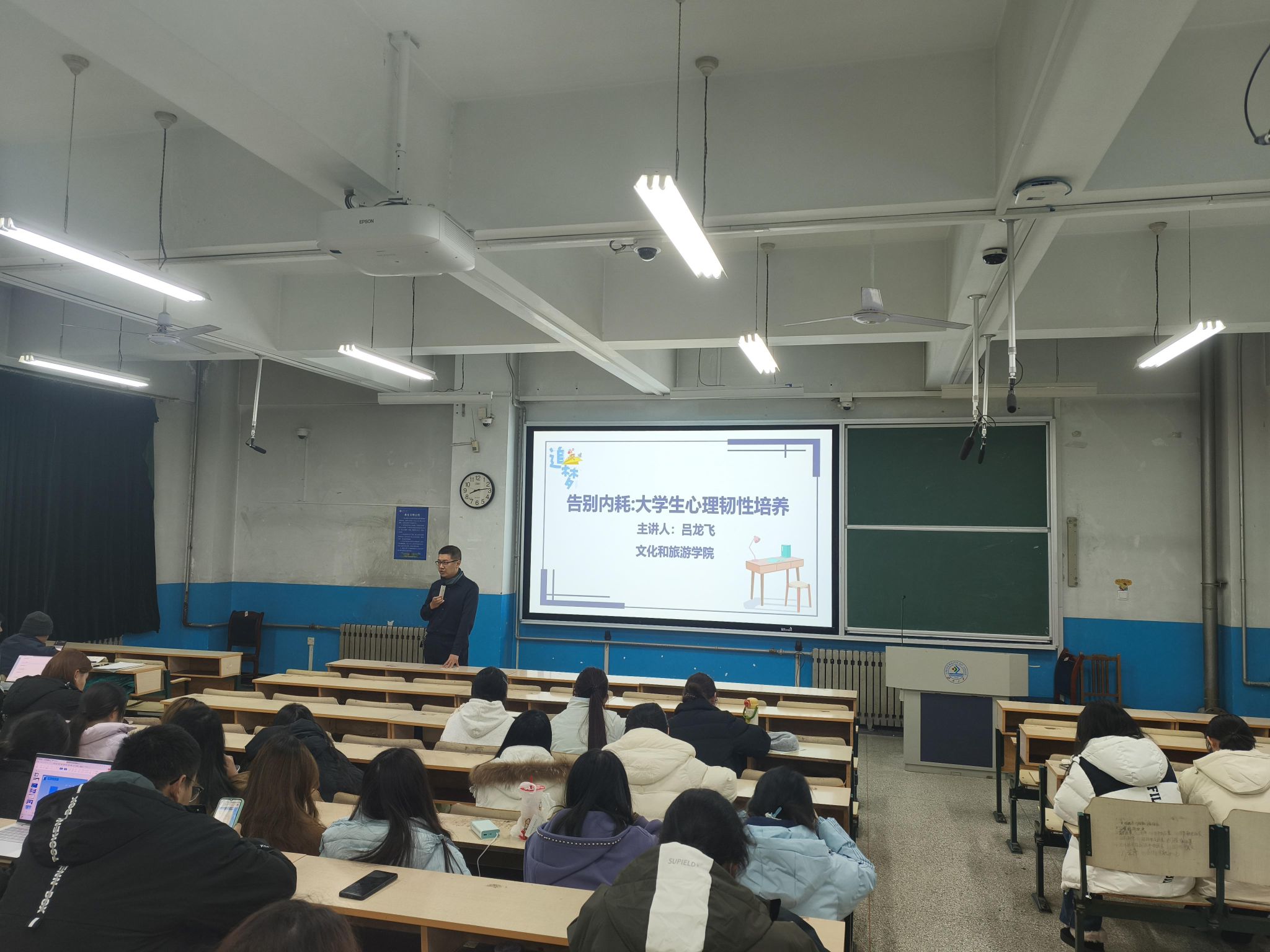 讲座由吕龙飞老师主讲,他首先以“你是否常在深夜反复回想白天对话?”“是否因追求完美而迟迟不敢行动?”等贴近学生生活的问题切入,迅速引发在场同学共鸣。他深刻剖析了“精神内耗”的本质——个体心理上的自我冲突、过度思虑与能量空转状态,并指出这是导致焦虑、抑郁和行动力下降的重要原因。