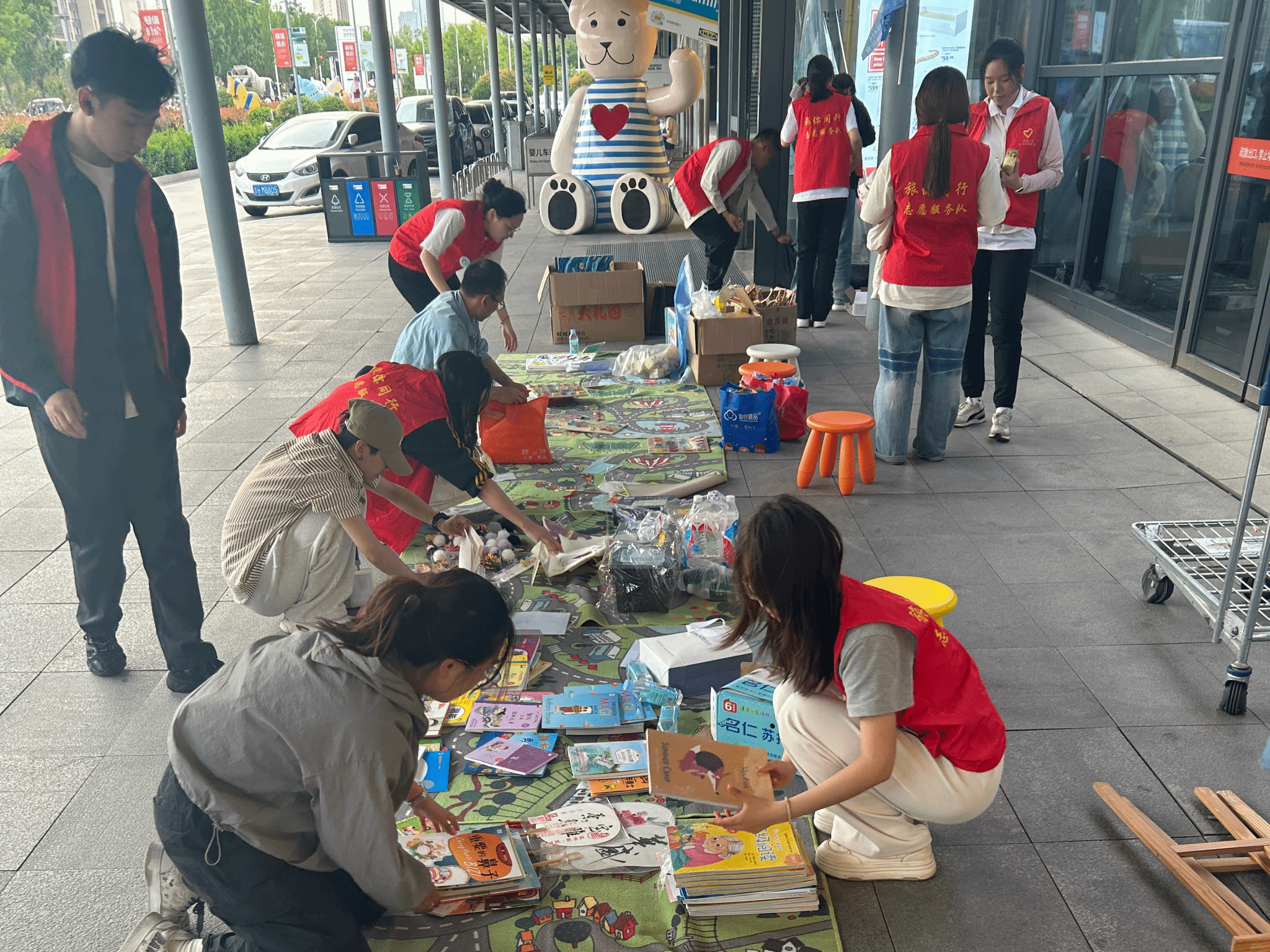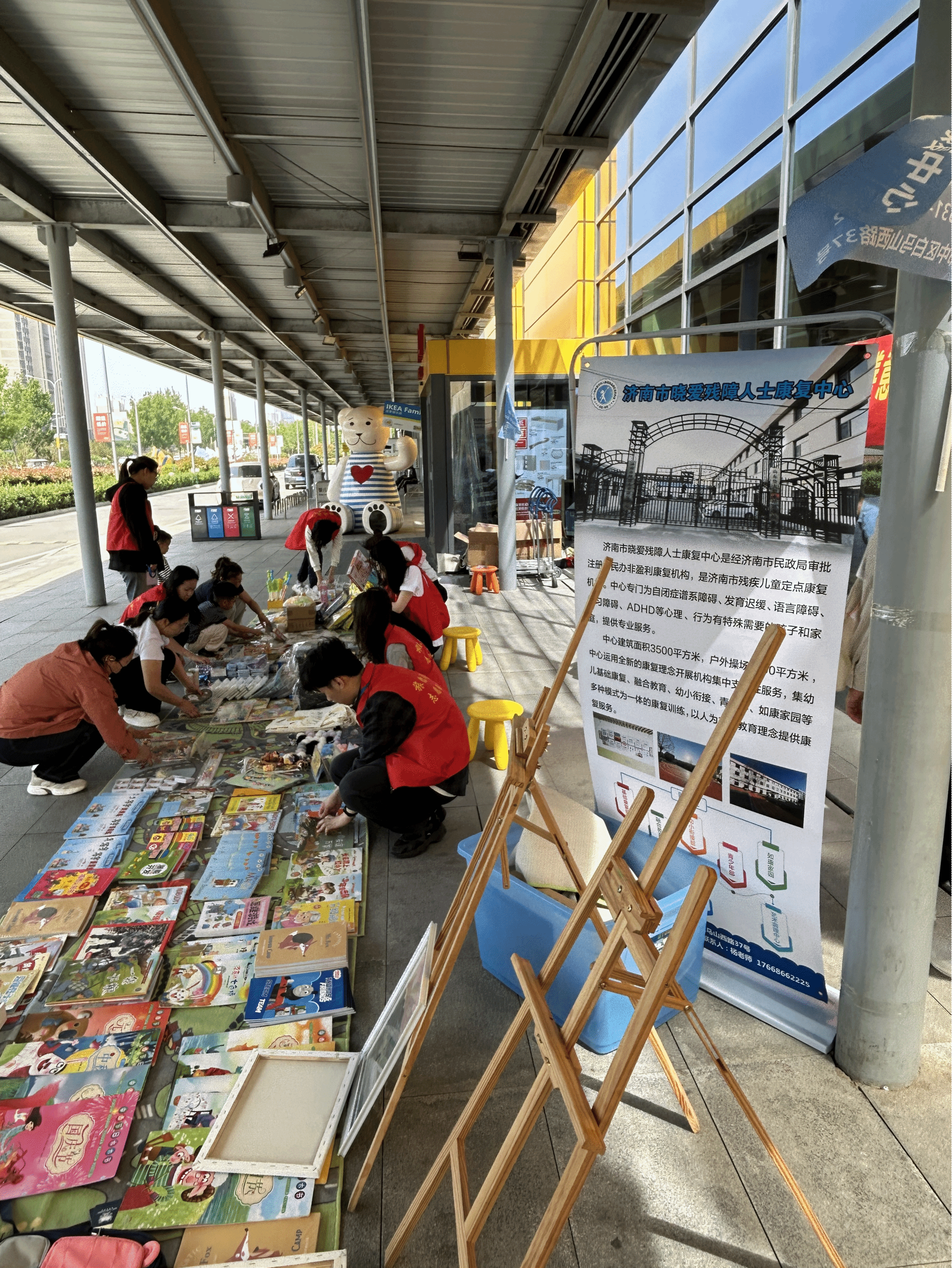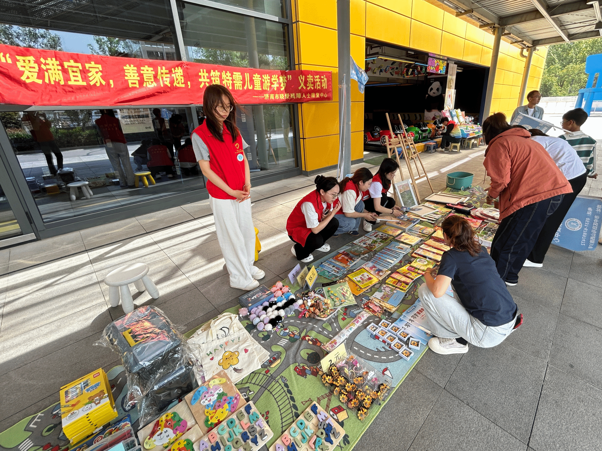 从晨曦微露到暮色四合,志愿者们以时光为笔,在9:30至17:30的光阴画卷上镌刻责任。他们是不知疲倦的“搬运工”,将一箱箱承载着希望的物资化作摊位上的星河——亲手搭建的展架上,扇子轻摇着夏日的诗意,风铃叮咚着童真的韵律,钥匙挂件闪烁着手工的温情。当阳光爬上他们汗湿的鬓角,他们又化身为灵动的“宣传员”,手持传单穿梭于人流,用微笑讲述康复中心与残障儿童的故事,让“每个孩子都该被世界温柔以待”的理念如春风拂过人心。